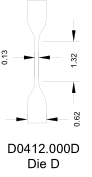 Model No. DIE.D0412.0004 Dumbbell Dies for Geometry “D”. 1.31” Gage length, 0.125” gage width, 0.62” Dumbbell grip width, 4.00” Total Length |